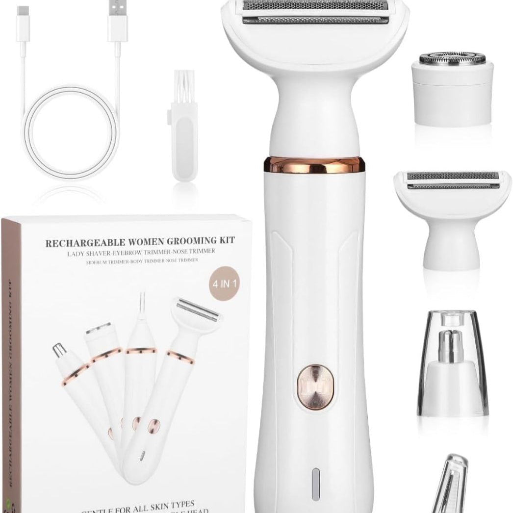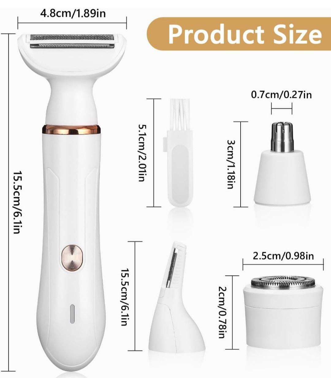 Descubre la Afeitadora Profesional Eléctrica Recargable 4 en 1 para mujer, la solución perfecta para mantenerte impecable en todo momento. Con diferentes cabezales intercambiables, es ideal para cejas, axilas, ingles y nariz, permitiéndote realizar una depilación precisa y cómoda en las zonas más delicadas.